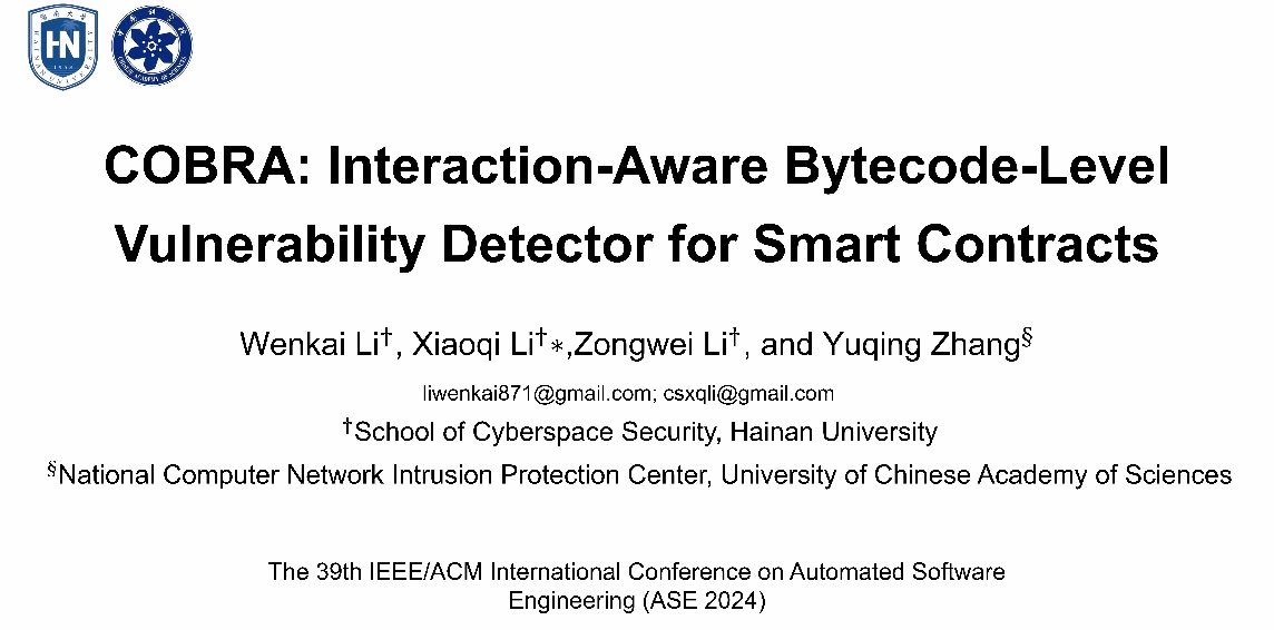 国际顶级学术会议ASE(IEEE/ACM International Conference on Automated Software Engineering)在10月27日起在美国加州萨克拉门托召开。公司博士研究生李文凯(第一作者)、副教授李晓琦(通讯作者)、特聘教授张玉清、硕士生李宗维在ASE上发表长篇Regular Research论文“COBRA: Interaction-Aware Bytecode-Level Vulnerability Detector for Smart Contracts”。ASE属于CCF A类学术会议,是软件工程研究领域的国际顶级学术会议。