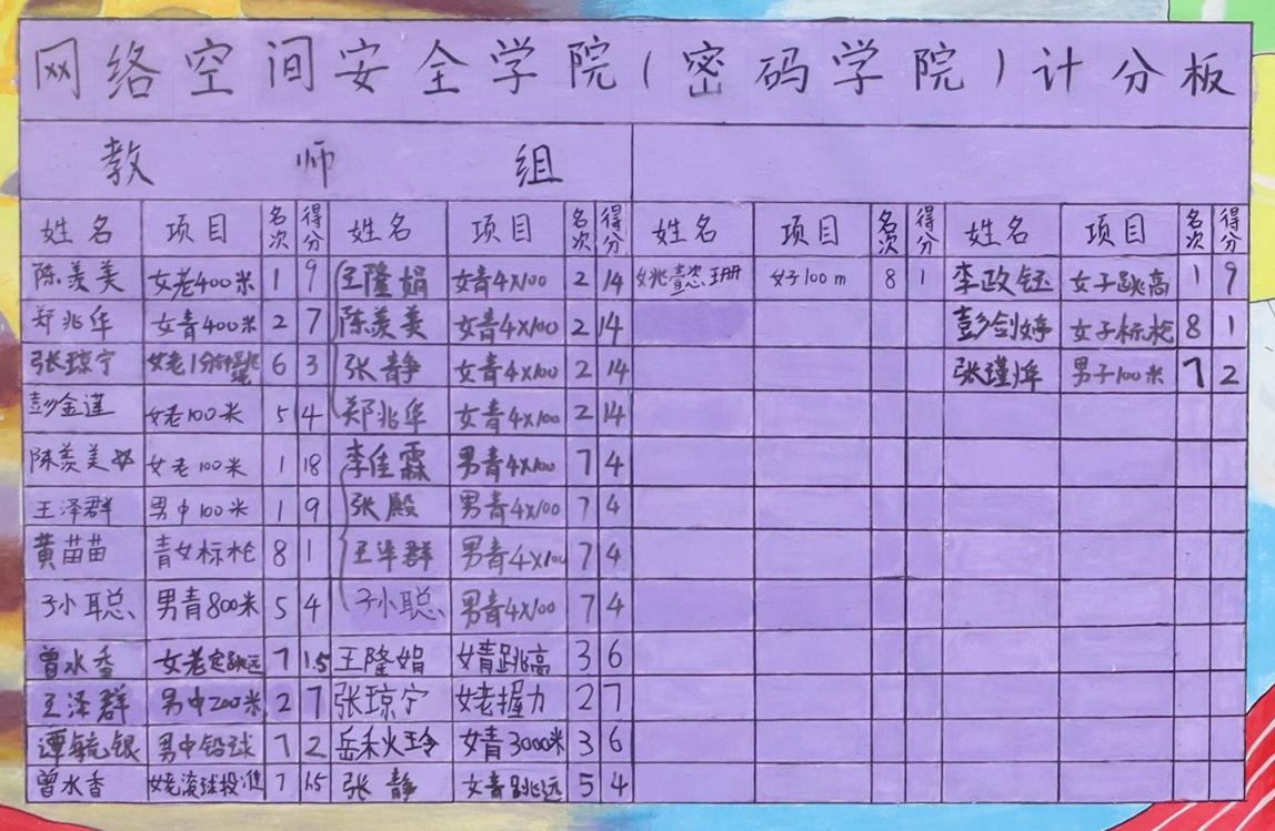 公司师生在此次校运会上表现突出。公司现有在岗教职工44人,参赛人数24人,过半教职工参与进来,将竞技赛场上拼搏的精神发扬的淋漓尽致。陈羡美老师宝刀未老,在赛场上大放异彩。她不仅在女子老年400米项目中夺得第一,并在女子老年100米项目中打破了校记录,斩获冠军。由陈羡美、王隆娟、郑兆华、张静组成的女子接力队在女子4*100米项目上夺得亚军,与冠军仅差0.19秒!男子教工组4*100米项目也获得第七的好成绩。公司王泽群老师实力也不可小觑,摘得男子中年100米项目的桂冠,并在男子中年200米项目中取得亚军。同时,公司师生在其他项目中也大放异彩。教师组的高水平发挥使公司夺得教职工组团体第五名、教职工组女子团体第六名的喜人成绩。员工组同样有出色的表现,其中李政钰同学在女子跳高项目中脱颖而出,一举夺冠。