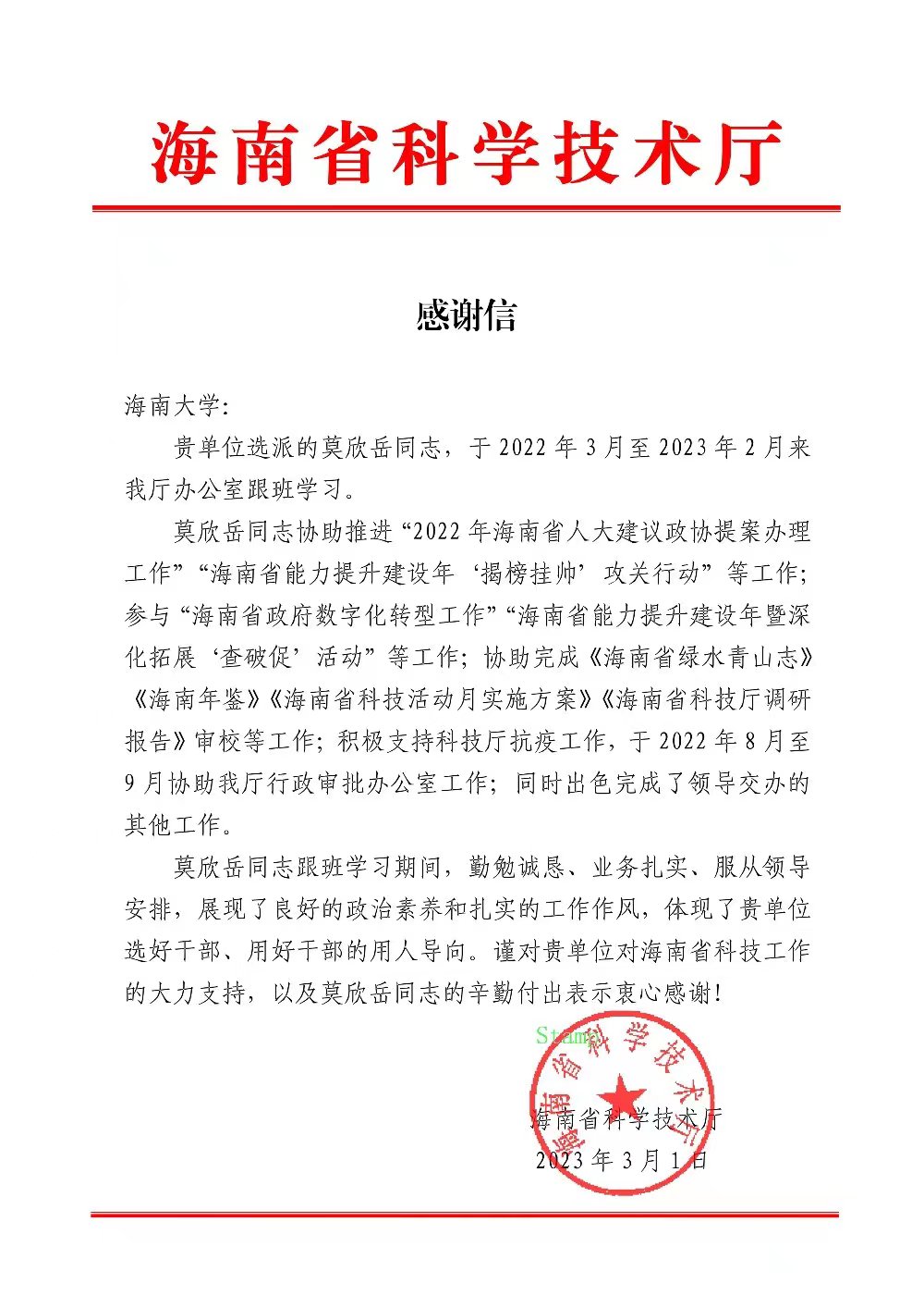 海南省科技厅对公司莫欣岳同志的感谢信
