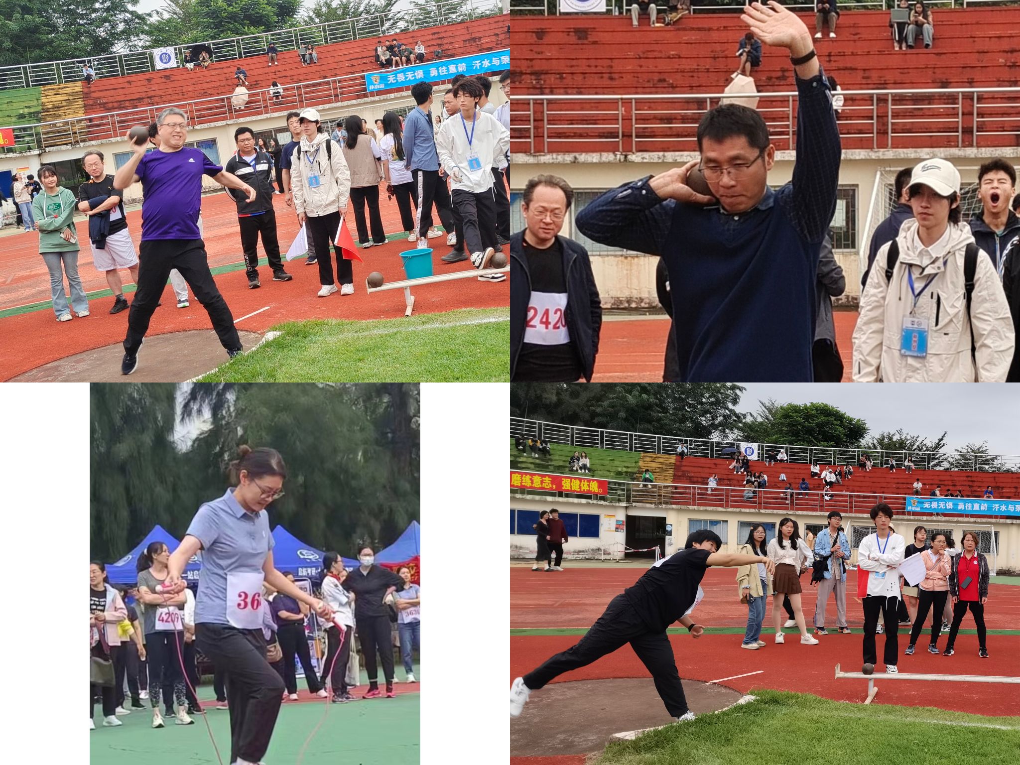 左上:张树东教授铅球比赛 右上:谭毓银老师铅球比赛
