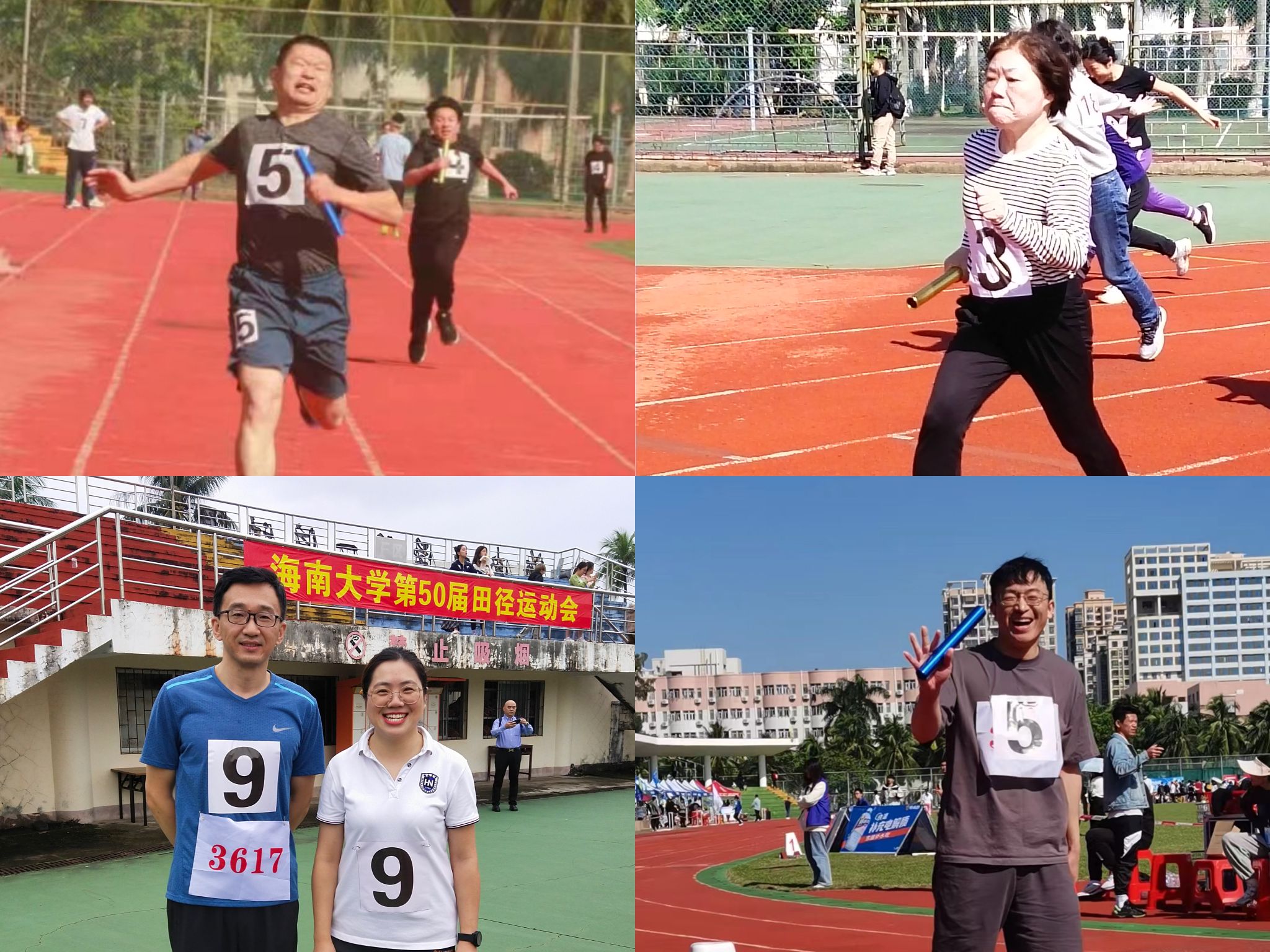 左上:张殿副经理接力赛 右上:陈羡美老师接力赛