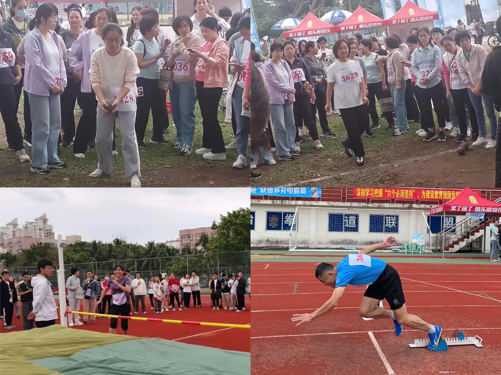 左下:王隆娟老师跳高比赛 右下:王泽群老师起跑精彩瞬间